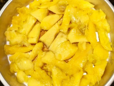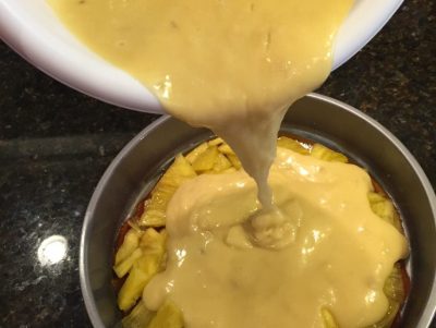 Once your caramel is poured, prepare your fruit and layer it in the pan. Make sure to peel apples, pears or peaches and slice them thinly. As you can see in the picture above, my mango was pretty soft, so it was difficult to slice. Even if it’s a little messy, it will still be delicious. For cake making, a little tip I learned a long time ago is to mix wet ingredients in a large pourable measuring cup, this makes it super easy to add them to the dry ingredients.