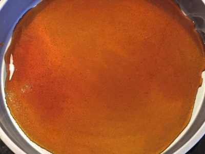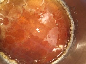 Once it it just about the color you want, add in the vanilla. It will bubble furiously. Give it a quick stir with a fork to mix in the vanilla. Immediately pour the mixture into your prepared cake pan, completely covering the bottom. The caramel will harden really quickly, so get it poured and spread as fast as you can. Don’t worry if the caramel cracks once you’ve poured it into the pan. It tends to do this if you move it to a cold surface or when you place cool fruit on top of it. No worries, it will bake up and get all gooey in the oven.