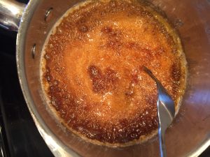 Prepare your 9 inch round cake pan by oiling the sides. You don’t have to oil the bottom as it will be covered by the caramel. The next step is to make your caramel. In a medium size saucepan combine the sugar and water and place over medium heat. Keep an eye on it and swirl the pan every once in awhile. You don’t need to stir it. You want to get it to a deep amber color, but be careful not to let it go too far as it will burn quickly. This should take around 7-10 minutes.